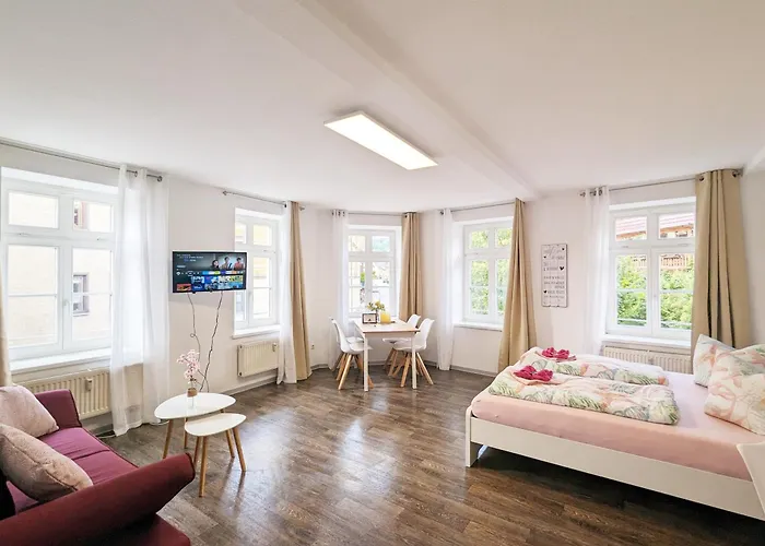 F2 - Urlaubsmagie Sauna, Pool & Garten Sebnitz, un appartamento con 1 camera da letto, offre prossimità ad attrazioni turistiche come Africa House Sebnitz, che si trova a soli 6 minuti a piedi. Gli ospiti potranno godere di una jacuzzi e una saunain quest'appartamento, situato a 150 metri daC Deutsche Kunstblume Sebnitz.